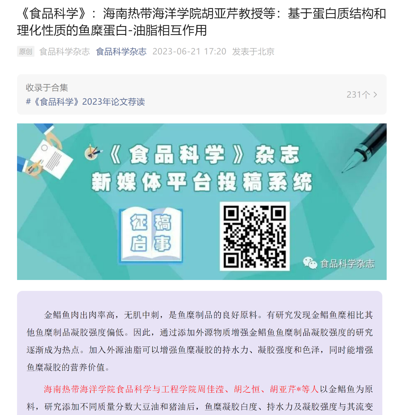 随着科研领域“破唯”行动的深入,抵制“唯SCI论”的公司越来越多,而国内中文顶刊也越来越重视录用论文的质量和学术水准。该论文为《食品科学》录用,并在官微荐读,极大提升了公司食品学科在国内同行中的学术影响力。