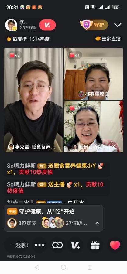 受中国营养学会膳食与烹饪营养分会秘书长李克磊教授的邀请,公司副经理胡亚芹教授于2025年9月6日晚19:30以连麦微博的方式参与直播,解放军总医院临床营养专家袁继红主任担任共同主持人,聚焦食品健康常识,进行了一场科普讲座,共同解析现代营养迷思,分享科学饮食方法,为观众带来一场实用的健康科普盛宴。直播间受众达2.35万人。