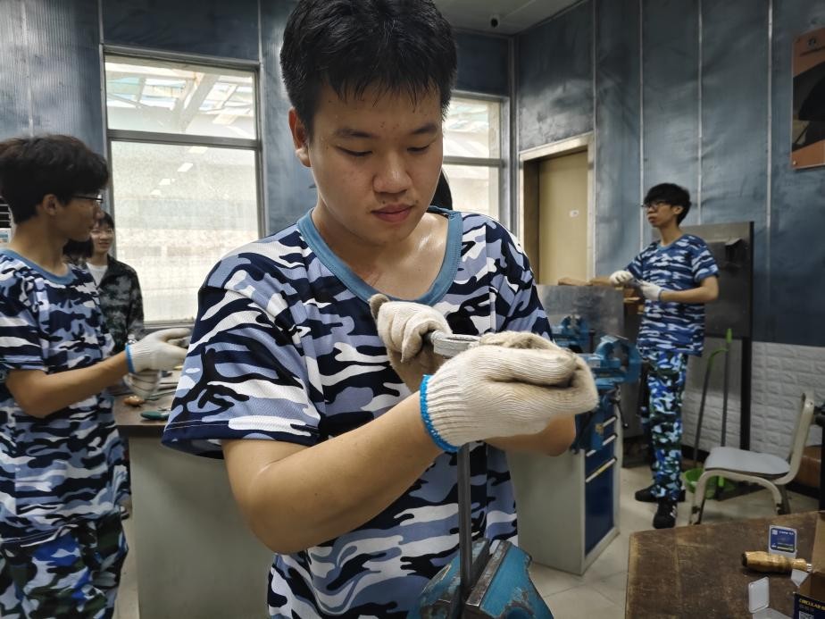 第三天的车工实训聚焦精密操作。同学们在车间技术老师指导下熟悉车床结构与运行原理,学习车削加工的核心技巧,通过调整转速、进给量等参数,将尼龙原料加工成符合尺寸要求的工件。同学们一边观察工件切削状态,一边精准调整操作,在“手脑并用”中理解机械加工的精度要求,提升对设备操控的熟练度。